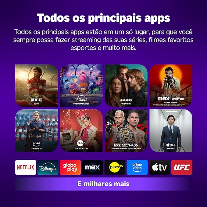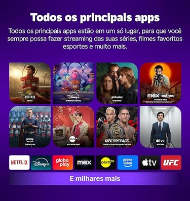 Com a plataforma de streaming nº 1 dos Estados Unidos, você tem acesso simplificado a milhares de filmes, séries, esportes, TV ao vivo e todos os principais aplicativos em um só lugar. A navegação é rápida, intuitiva e acompanhada de um controle remoto completo, que permite ligar a TV, ajustar o volume e realizar buscas por voz com facilidade.