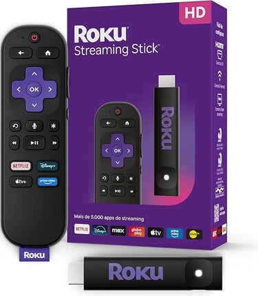 Transforme qualquer televisão em uma Smart TV poderosa com o Roku Streaming Stick HD. Compacto, discreto e fácil de instalar, ele se conecta diretamente à porta HDMI e pode ser alimentado pela própria TV via USB, eliminando cabos extras e mantendo tudo organizado.